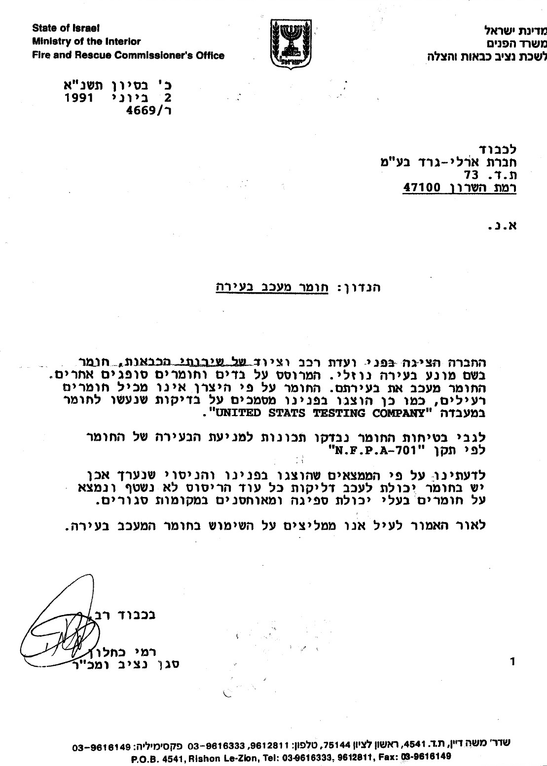 "ארלי גרד" הוא החומר היחיד בישראל שמומלץ ע"י קצין כבאות ראשי ונבדק במכון התקנים לפי תקנים 755 ו – 5093.